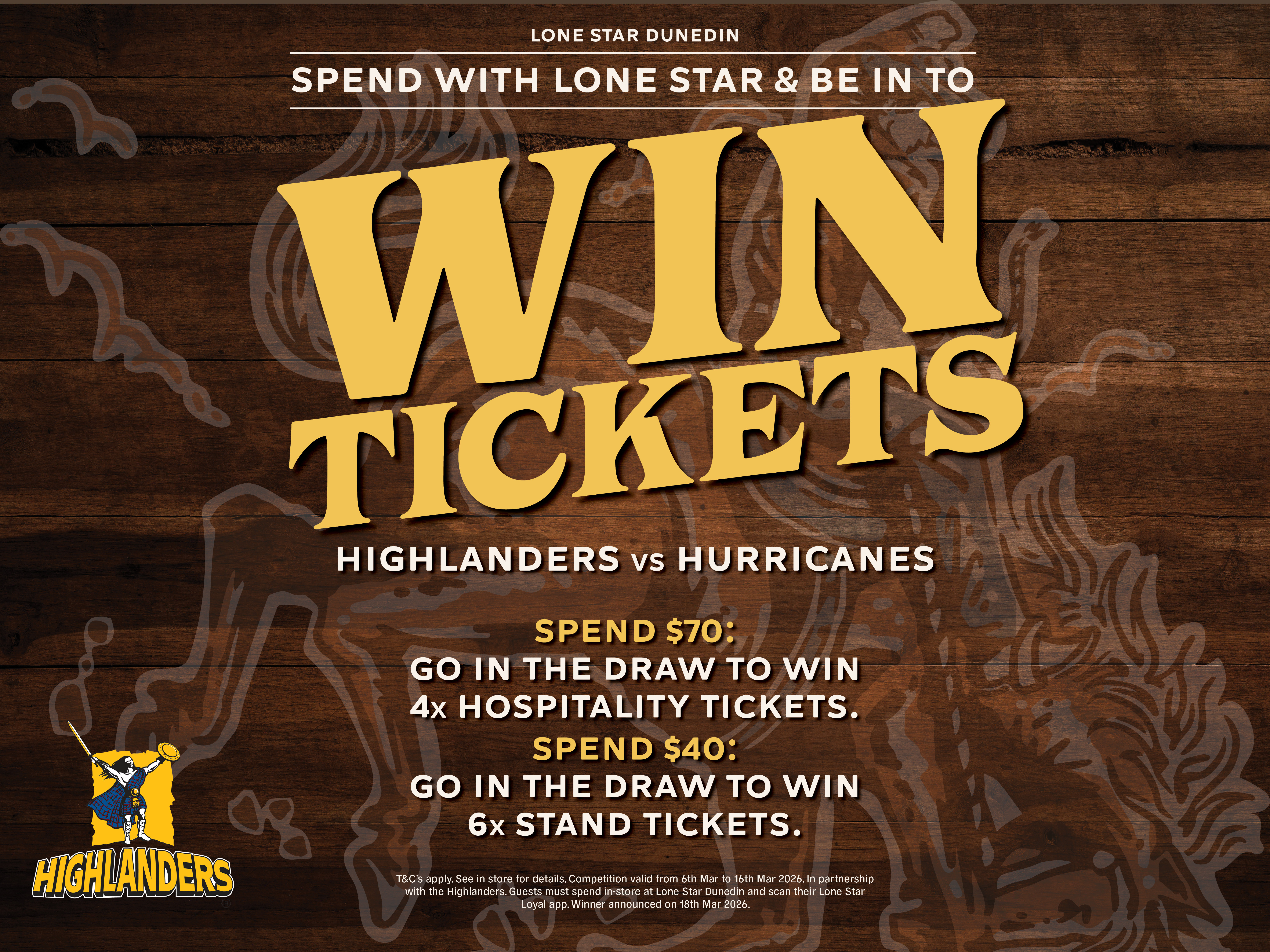 From 6th March to 18th March 2026, every in-store visit to Lone Star Dunedin could put you in the stands (or the hospitality suite!) at the Highlanders vs Force home game at Forsyth Barr Stadium.